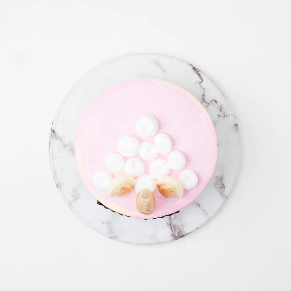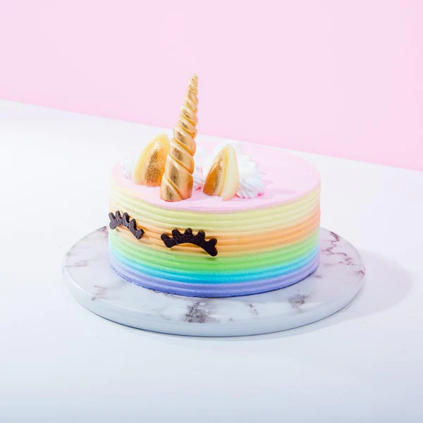 Six layers of pastel rainbow-colored vanilla cake filled high with a sweet and sour strawberry mousseline.