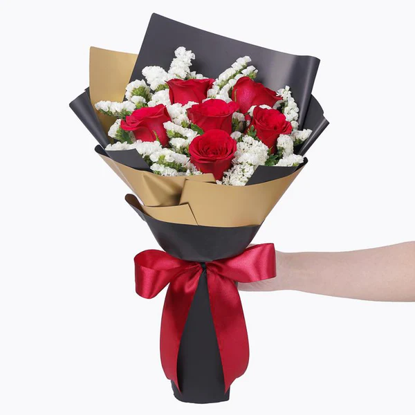 A bouquet of red roses accompanied by white statice. A bouquet wrapped to perfection and suitable for any occasions as red roses simply symbolizes your passion, true love and desire while leaving the white statice to portray your utmost sincerity. This is the go-to gift that expresses your love and intentions without having to say a word.