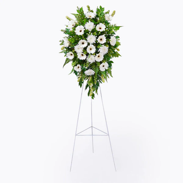Our Flower Stand “Peacefully” is a respectful way to show condolences and sympathy for a beloved family member, friend, or colleague. A timeless funeral flower stand.